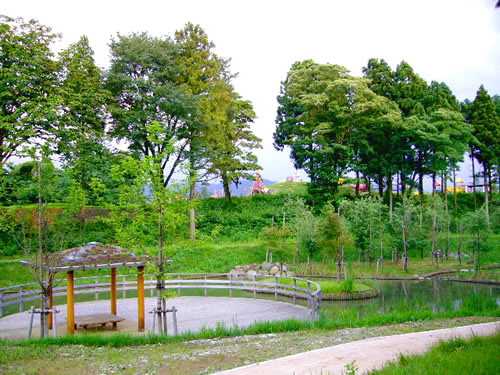 木に囲まれて、池の水が涼しく感じるエリアです。散歩コースにご利用ください。